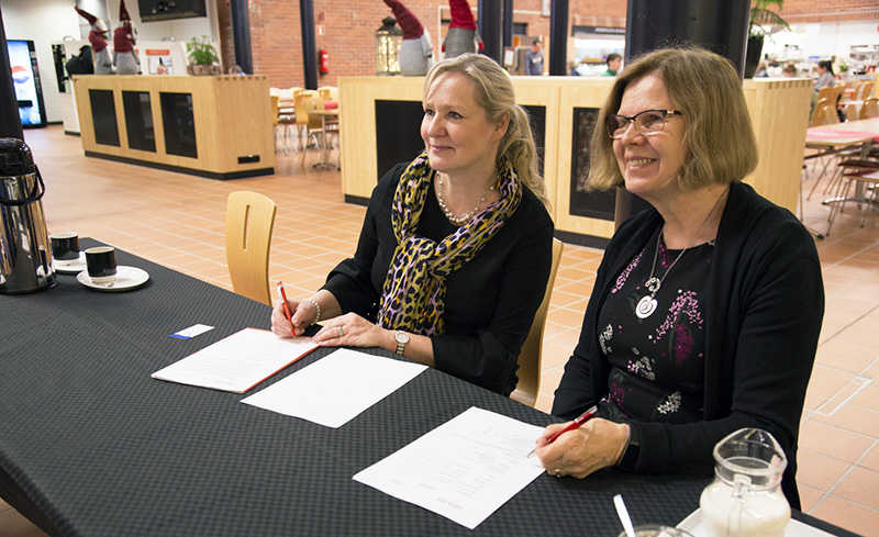 Toimitusjohtaja Anne Salo-oja luovutti lahjakirjan rehtori Riitta Rissaselle viime maanantaina.